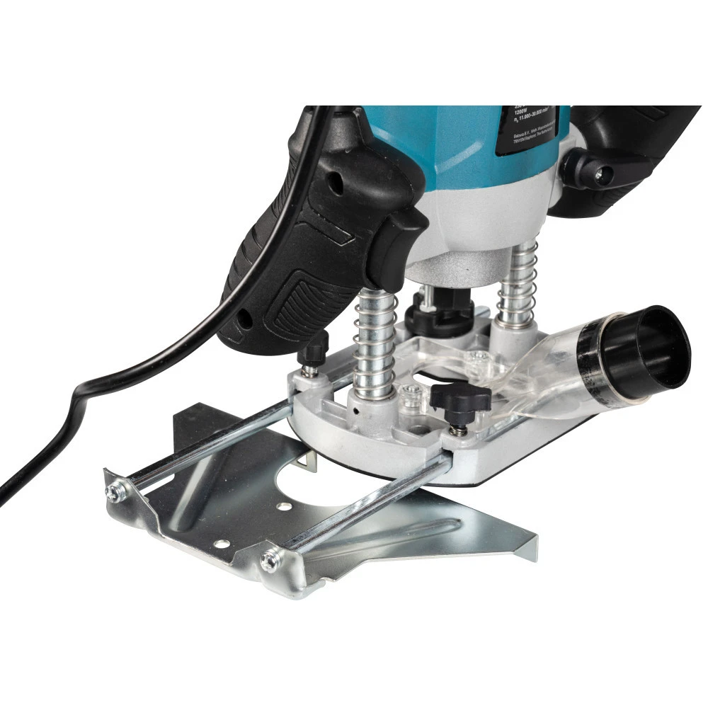 Diese kraftvolle 1200 W Oberfräse von GERMANIA ist das ideale Werkzeug zum Einfräsen von Nuten, Profilen und Fasen. Der Saugschlauch lässt sich an den mitgelieferten Staubabsaugadapter anstecken und sorgt so für einen sauberen Arbeitsplatz. Ebenfalls enthalten sind zwei Spannzangen von 6 & 8 mm. Mit der Zirkelspitze können problemlos Kreise, Radien und runde Ausschnitte gefräst werden.